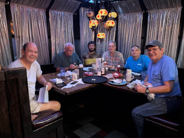 With rain stifling flying today, Peter Fynn, Skip Wescott, Stephen Yanacek, Robert Yanacek, Pete Carros, and Jim Davis met at the Jolly Roger Restaurant for breakfast and to discuss their latest activities and projects.