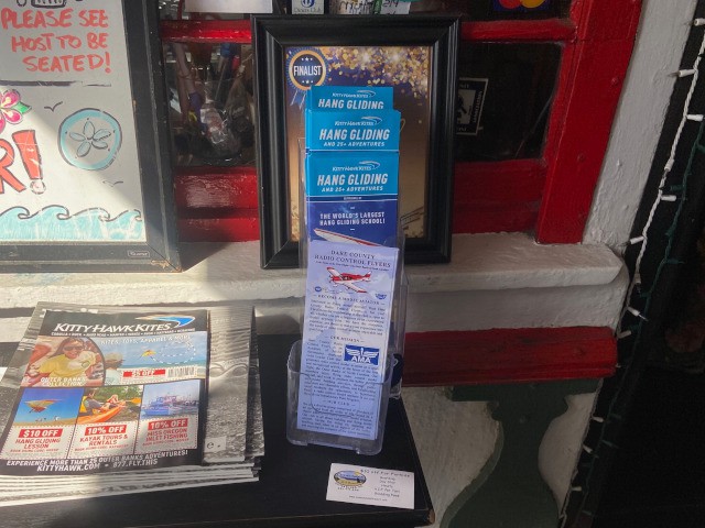 Five club members met today for breakfast and to do planning for the upcoming Outer Banks Festival of Model Aviation event at the Jolly Roger Restaurant. In addition, marketing materials for the event and the club were placed on display in the restaurant's lobby.