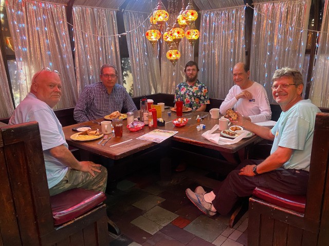 During the past few days we had frequent rainfall to the point that it was far too wet to use our flying field. Instead of flying, Skip Wescott, Robert Yanacek, Stephen Yanacek, Peter Fynn, and Jim Davis met for breakfast and discussion of current projects and upcoming events at the Jolly Roger Restaurant.