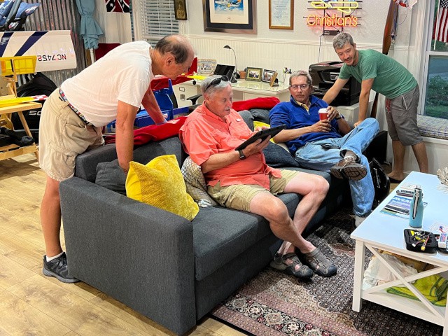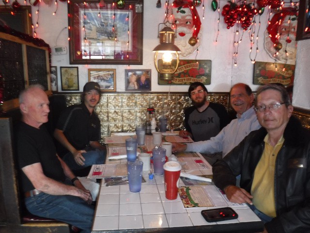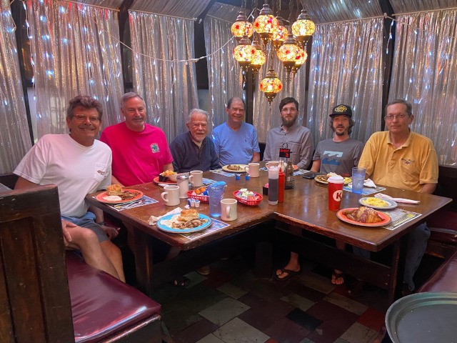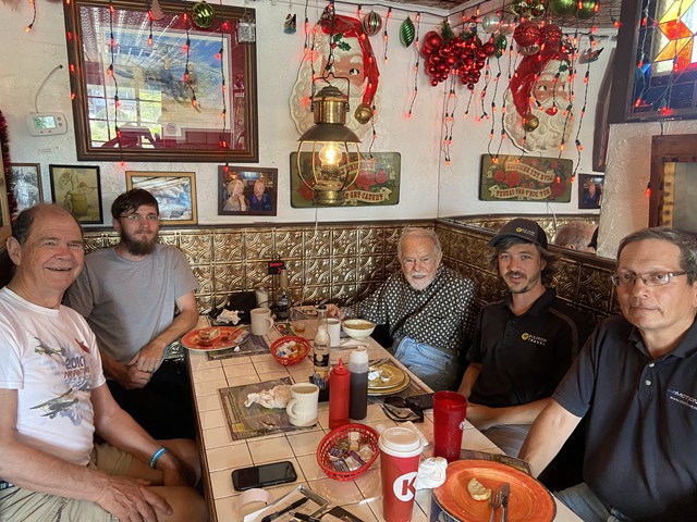 Jim Shiels, Philip Garey, Stephen Yanacek, Peter Fynn, and Robert Yanacek met today for breakfast at the Jolly Roger restaurant in Kill Devil Hills to talk about model airplanes, flying, and upcoming club events.