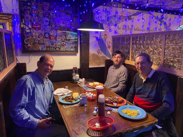 With hopes of flying today dashed by the rain, Peter Fynn, Stephen Yanacek, and Robert Yanacek met instead for breakfast at the Jolly Roger restaurant in Kill Devil Hills to talk about our latest model airplane projects.
