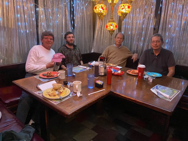 Jim Davis, Stephen Yanacek, Peter Fynn, and Robert Yanacek met this morning at the Jolly Roger for breakfast and discussion about our build session last evening. Also discussed was Jim's idea to construct Tiny-Tony foam board electric-powered planes for our next group build, culminating in a pylon race at our flying field.