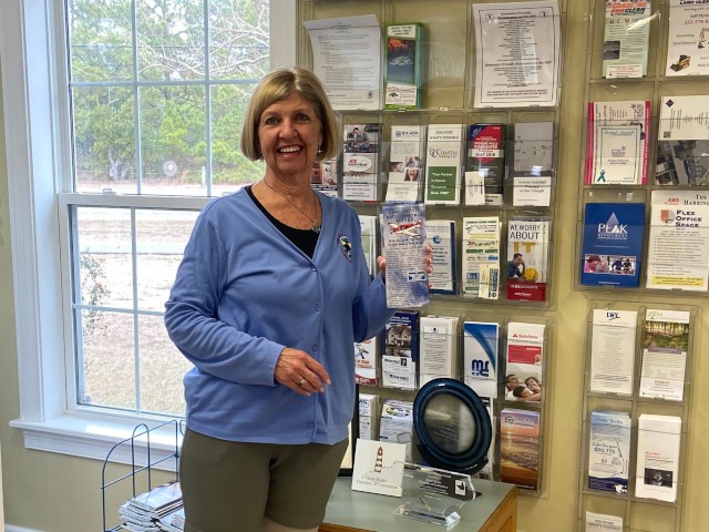 Our club's informational rack card was added today to the business information display in the lobby of the Outer Banks Chamber of Commerce, located at 101 Town Hall Drive in Kill Devil Hills. Julie Walter, the chamber's membership services director, accepted our newly printed rack cards, and placed them on display.