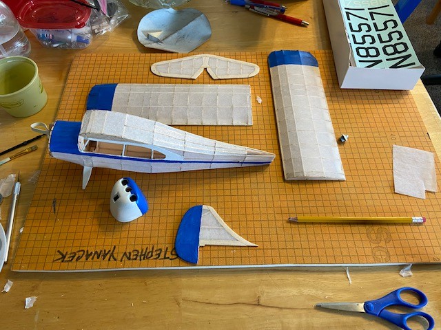 Following another week of continuing to build at home, participants met once again. With all the framing now completed, we received a quick class from Peter Fynn about the process of covering our models with silkspan. Using a diluted glue mixture, Jim Davis, Jim Shiels, Stephen Yanacek, Philip Garey, Robert Yanacek, Matt Cooke, and Kolton Cooke turned-to and began the covering process. Over the next hour and a half, we all completed covering the surfaces of the wings and empennage.