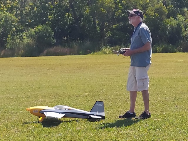 We also welcomed a new member, Allen Massey, to our club today. Allen had flown radio control planes in the past, and despite a 20 year hiatus, he performed two flights very well with Robert Yanacek's popular Valiant aircraft. Allen also brought his new plane, a beautiful E-flite Extra 300, to the field for "show and tell."