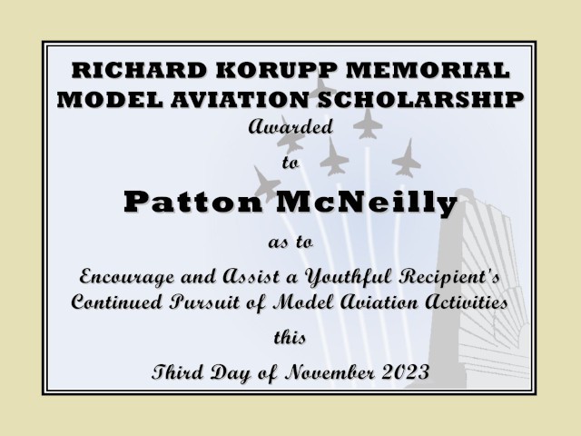 Patton's scholarship was the first of two that was gifted to the club through the generosity of Carole Korupp in honor of her departed husband, Richard, who enjoyed model aviation, and serves to perpetuate his memory by recognizing and aiding a young recipient with a gift related to the hobby. A presentation of the second scholarship to middle-school student, Foster Downing, is forthcoming.