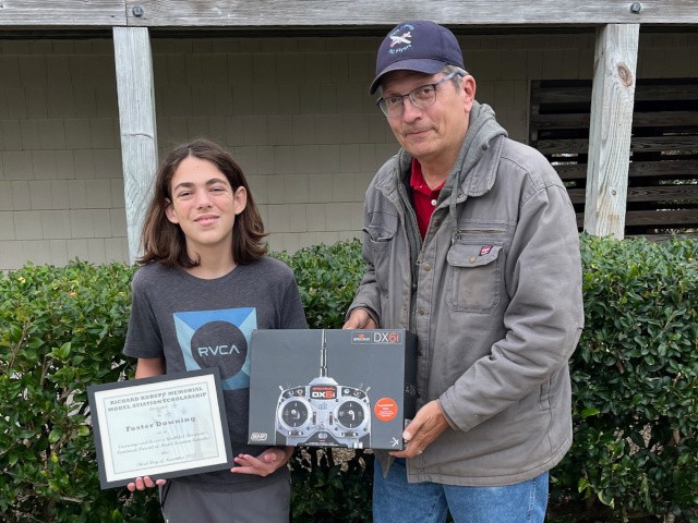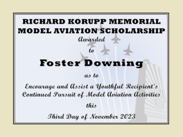 Foster's scholarship was the second of two that was gifted to the club through the generosity of Carole Korupp in honor of her departed husband, Richard, who enjoyed model aviation, and serves to perpetuate his memory by recognizing and aiding a young recipient with a gift related to the hobby. The presentation of the first scholarship, to Patton McNeilly, was made last Saturday.