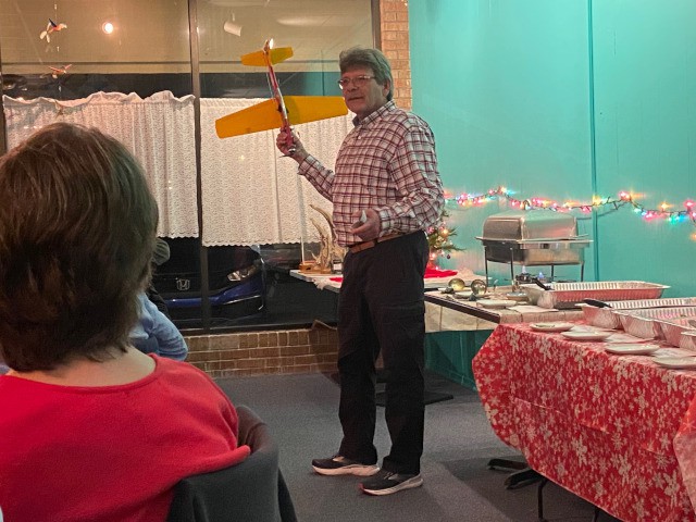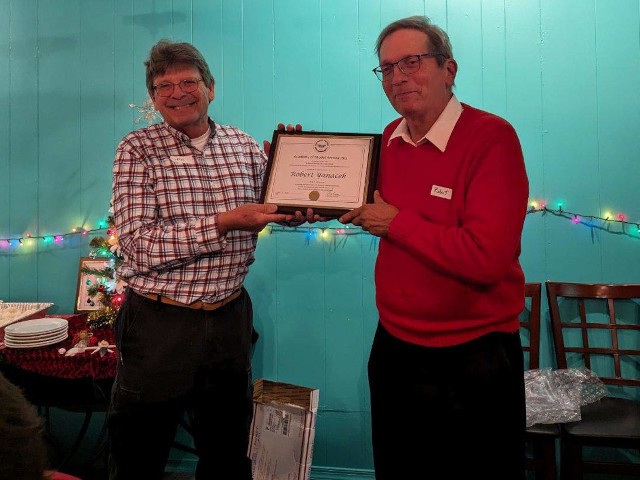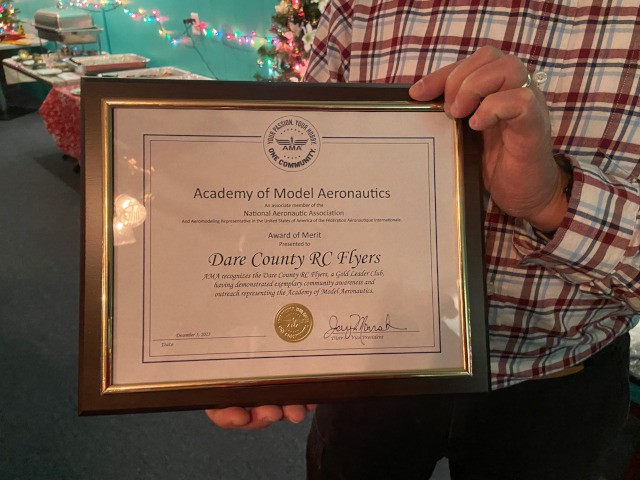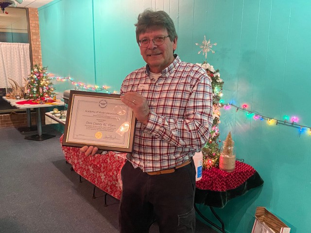 Following dinner, club president, Jim Davis, summarized the past year and expressed his thanks to everyone for their hard work. Jim then displayed an Award of Merit he recently received from the Academy of Model Aeronautics recognizing our club's exemplary community awareness and outreach efforts. Jim then presented a certificate of appreciation on behalf of the Academy of Model Aeronautics to our club vice-president, Robert Yanacek, in recognition of his dedication and commitment to the club and aeromodeling.
